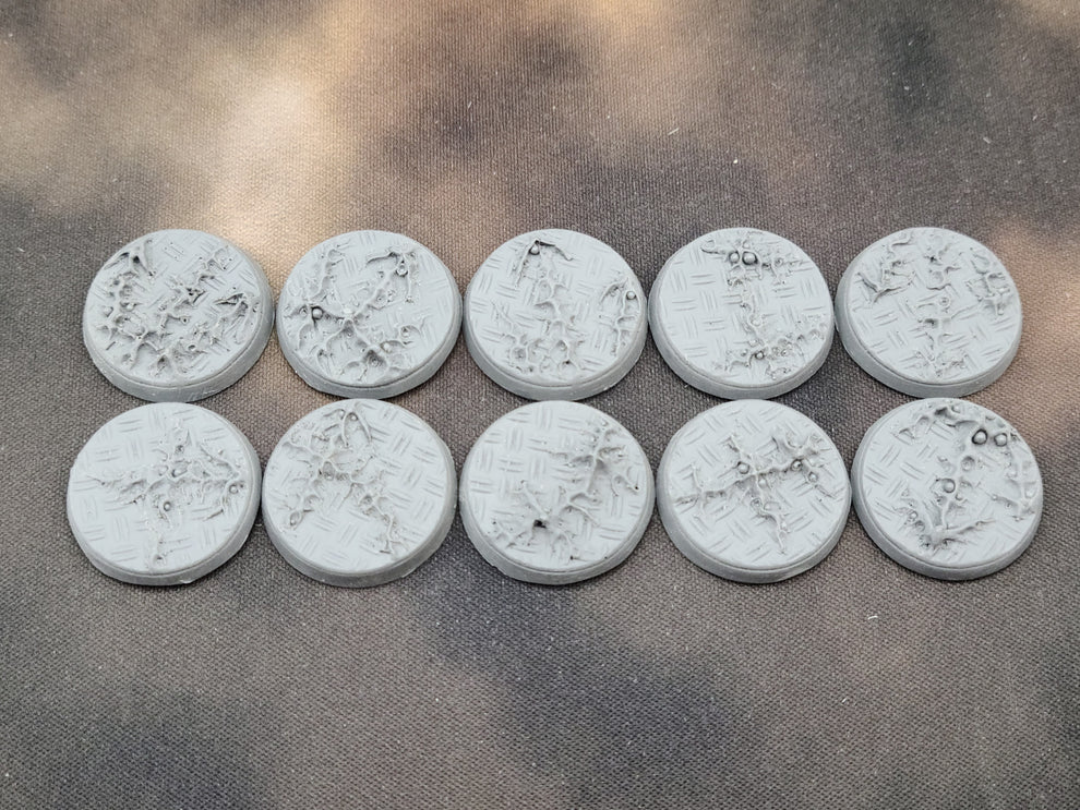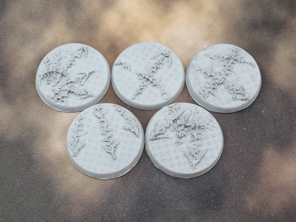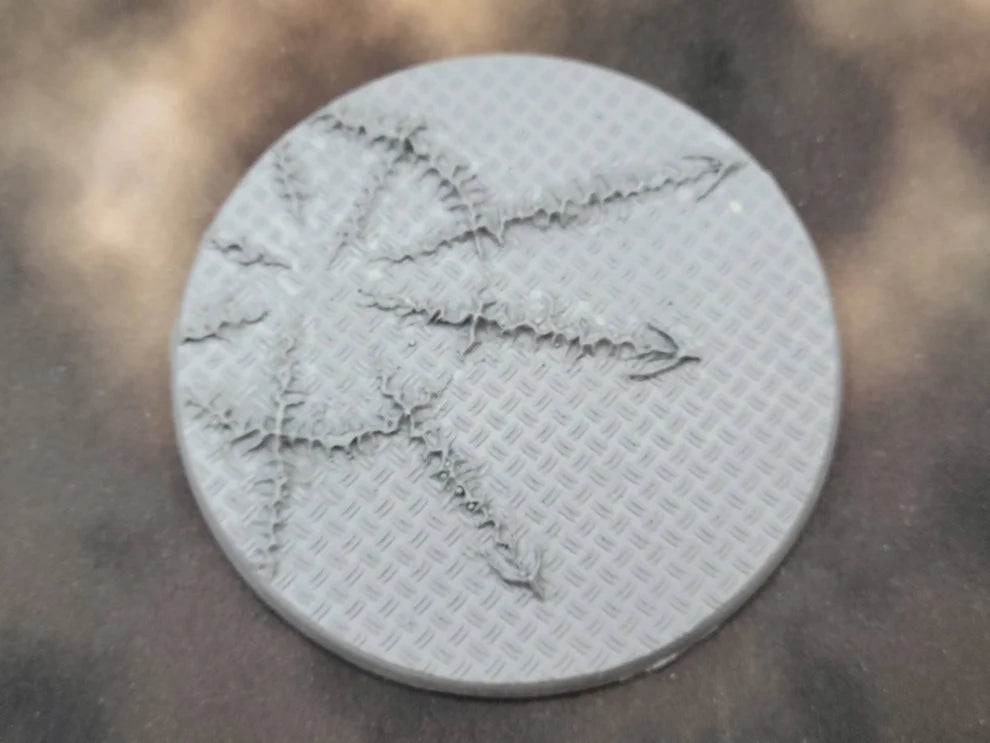 The eight-pointed star. It could mean possibilities. It could mean uncertainty. But too often it is a symbol of the agents of disorder -- the forces of Chaos. Whether you’re an incarnation of the eternal champion or praising the dark pantheon, or combatting the armies of the false emperor, these textured bases will suit your needs and fulfill your darkest desires. Here we offer bases that depict slices of the ubiquitous symbol in pieces of creeping corruption-- of Crawling Chaos.